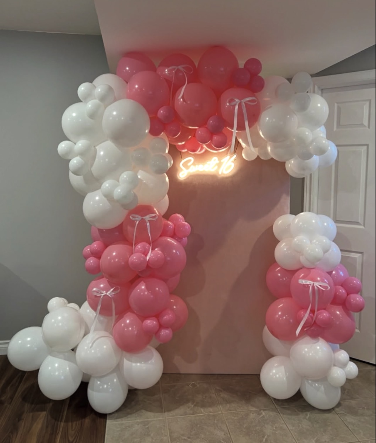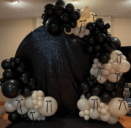Organic balloon arch with custom backdrop and bow add-ons