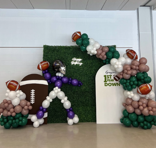 Custom balloon arch, themed backdrop, and Custom balloon football player